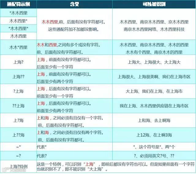 ?代表任意单个字符,*代表任意多个字符。~?和~*才分别代表?和*本身。木木做了一个表格,做了比较详尽的说明。(一定要注意?和*一定要在英文输入法中输入,否则无效)