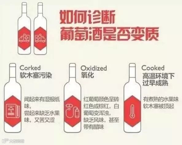 TIPS:葡萄酒的颜色变深,香气和口感变差,原有的明快的水果味变成炖熟的水果味。此外,高温还会使瓶中气压增大,将瓶塞顶起来。有时葡萄酒香气涣散或闭塞,结构松散,毫无生气,有可能并不是变质了,而是发生了“晕瓶”(Bottle Shock)的现象,这种情况下,只需静置一段时间,葡萄酒就能恢复正常。因此,如果我们怀疑一瓶酒有缺陷,而不十分确定的话,可以醒酒30分钟左右,若醒酒后缺陷依旧存在,那就要考虑是否选择将酒退给商家了。
