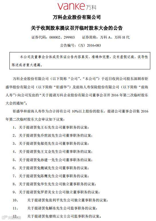 6月26日下午,深圳钜盛华及前海人寿(即宝能系)向万科董事会提请召开临时股东大会,并提出罢免万科现任董事会10名董事及2名监事会成员的议案。