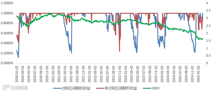 如果我们考虑一个对称区间的区间累计期权作为基准投资策略,会获得怎样的一个回报?我们使用2020年以来的历史数据进行回测(全回测周期为2020年1月2日至2025年2月14日),假设每天买入一笔对称区间的区间累计期权,测算其收益情况。历史回测仅供参考,不能代表未来收益情况。