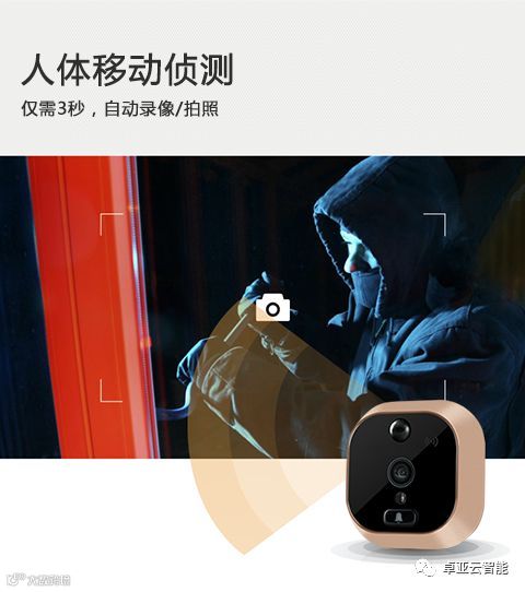 卓亚云智能的智能猫眼和智能锁还能无线联动,时刻反馈家门外的实时信息。”