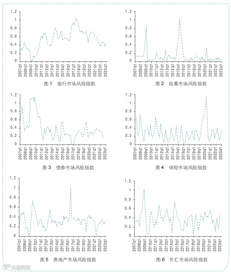 银行市场的风险主要体现在流动性风险水平上,考虑到银行间拆借行为在维护银行市场稳定中发挥了重要作用,本文选取3个月期银行间同业拆借利率与3个月期定期存款利率之差作为衡量指标,该值越大反映拆借成本越高,从而可能弱化拆借行为,降低银行抵御风险的能力;股票市场的风险主要体现在波动率上升或者流动性水平降低等,本文选取我国上证指数GARCH波动率衡量股票价格波动,股票市场波动剧烈会引起市场的恐慌性抛售,影响股票市场功能的正常发挥;债券市场的风险主要体现在期限利差的波动上,本文选取剩余年限1年与剩余年限 10年国债收益率之差衡量期限利差,利差的波动会影响投资者持有长短期资产意愿与市场流动性;保险市场的风险主要体现在综合赔付变动上,本文选取当期原保险赔付额除以当期向前一年时间段原保险赔付额的最小值来衡量赔付变动情况①,保险机构负债端承压会增加经营压力,由于其覆盖面广、与市场联动性强,从而对金融市场甚至实体经济造成冲击;房地产市场风险主要体现在房产交易情况以及房价波动上,本文选取中国国房景气指数变化率衡量房地产市场活跃程度,房地产市场与金融机构和金融市场关联性极强,房产市场景气情况易对整个金融体系造成影响;外汇市场风险主要体现在本国货币币值波动上,本文选取人民币名义有效汇率指数变动率来衡量人民币汇率变动情况,汇率大幅波动导致的人民币剧烈贬值或升值会对资本项目和经常项目造成非正常的扰动,特别是发生恶性贬值情况下容易造成资本大幅流出,若处理不当易导致汇率进一步贬值的恶性循环,进而引发系统性金融风险甚至经济危机;货币市场风险主要体现在流动性水平和利率变动上,本文选取一周和一年期SHIBOR期限利差来衡量长短期资金拆借利差,危机越严重,持有短期容易变现资产的意愿越强烈,则利差越大,从而反映市场风险水平。
