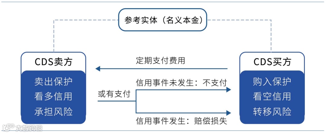 信用违约互换是一种信用类衍生品合约。在一笔信用违约互换交易中,信用保护买方向信用保护卖方支付保护费用(Premium Leg),以换取针对参考实体(Reference Entity)的信用保护。当参考实体发生双方约定的信用事件时,卖方向买方支付一定金额的补偿(Protection Leg)。故在现金流上,信用违约互换类似针对参考实体的信用保险,但信用违约互换本身不构成保险合同。在风险承担上,信用违约互换卖方是信用风险交易市场的多头,信用违约互换买方是信用风险交易市场的空头。
