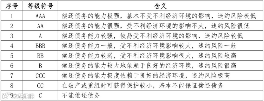估值分类评价标识包括AAA、AA、A、BBB、BB、B、CCC、CC和C级共九档,各档次可用“+”、“-”符号进行微调,表示略高或略低于本等级;微调不改变所在档次。等级含义见表1:
