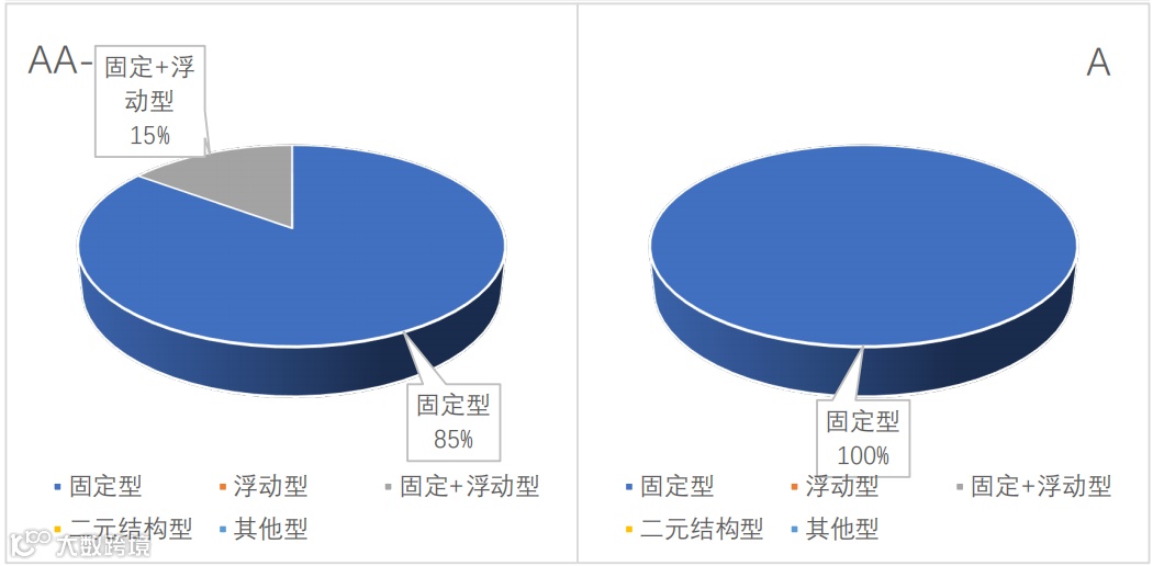 从认购金额来看,本周发行的AAA估值等级收益凭证中,75.23%为固定型收益凭证,24.77%为固定+浮动型收益凭证,未发行浮动型、二元结构型和其他型收益凭证;AA+估值等级收益凭证中,49.25%为固定型收益凭证,50.75%为固定+浮动型收益凭证,未发行浮动型、二元结构型和其他型收益凭证;AA估值等级收益凭证中,10.10%为固定+浮动型收益凭证,89.90%为固定型收益凭证,未发行浮动型、二元结构型和其他型收益凭证;AA-估值等级收益凭证中,83.56%为固定型收益凭证,16.44%为固定+浮动型收益凭证,未发行浮动型、二元结构型和其他型收益凭证;A估值等级收益凭证中,全部为固定型收益凭证。