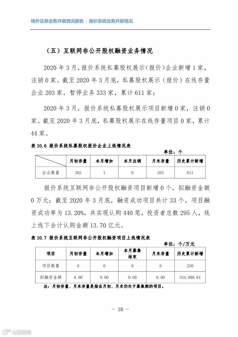 报价系统业务:2020年3月,报价系统发行私募产品829只,发行金额423.91亿元;实现产品转让132笔,转让金额6.74亿元;场外衍生品在线签约新增名义本金9.03亿元。