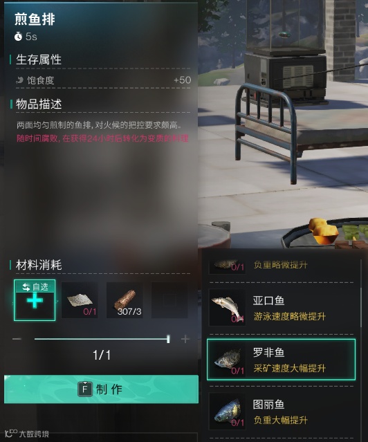 加工后的鱼类也是如此,用罗非鱼制成的煎鱼排可以提供“挖矿加速”的效果,非常适合休闲玩家。烤鲑鱼则拥有防腐的效果,适合长时间外出冒险时携带。