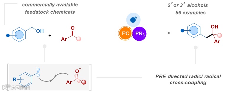 近年来,涉及自由基活性物种参与的光催化反应在各种具有挑战性的断键、成键转化中展示了无与伦比的优势。此外,光催化生成磷酰基自由基介导的直接脱氧、脱硫转化最近已发展成为一种获取多种自由基的通用方法。本研究团队在先前研究工作(Org. Lett. 2019, 21, 2658−2662;Angew. Chem. Int. Ed. 2022, 61, e202211035;Org. Lett. 2023, 25, 9014–9019;Org. Lett. 2024, 26, 8100–8105;Org Chem. Front. 2024, 11, 4187-4193)的基础上,创新提出在三价膦试剂的存在下,利用单一循环光催化循环同步产生苄基自由基与羰基自由基,并通过持久自由基效应导向促进二者的选择性交叉偶联,实现醇与羰基化合物的直接脱氧C–C键构建,为高效合成拥挤醇类分子提供一条温和、绿色的新途径(图1c-1d)。