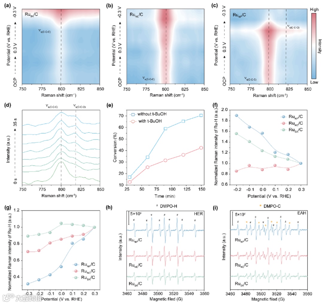 图 2 反应机理解析。(a-c)在 1.0 M 丙酮-K2CO3中,RuSA/C、RuNC/C与RuNP/C的原位 SERS;(d)-0.1 V(RHE)下 RuNP/C 的原位 SERS;(e)有/无叔丁醇条件下RuNP/C的丙酮转化率对比;(f, g)三种催化剂上Ru-H拉曼峰归一化强度随电位变化曲线,分别对应无丙酮(f)与有丙酮(g)体系;(h, i) HER(h)与EAH(i)条件下吸附H*的EPR信号。