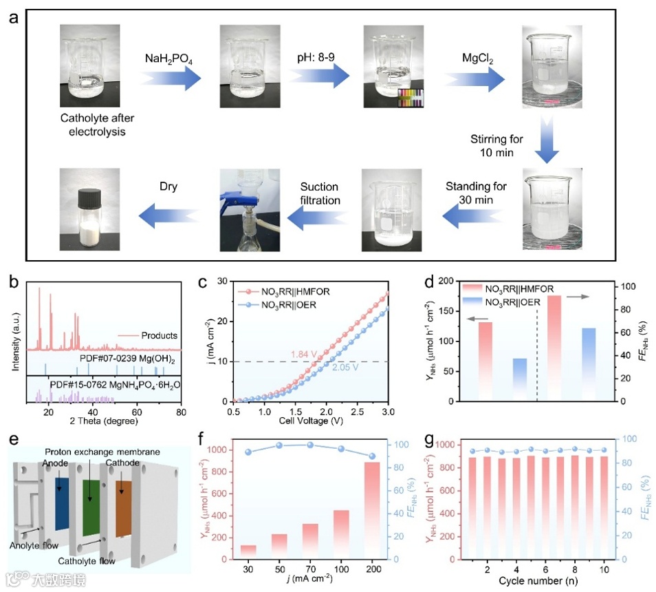 图6. 应用。a) 鸟粪石合成过程照片。b)合成鸟粪石的XRD图谱。c) NO3RR//OER和NO3RR//HMFOR电解槽的LSV曲线。d) 在2 V电压下,基于F, P-Co的NO3RR//OER和NO3RR//HMFOR电解槽的YNH₃和FENH₃。e) NO3RR//HMFOR流动池示意图。f) 在含有10 mM KNO3的流动池中,不同电流密度下的YNH₃和FENH₃。g) 在200 mA cm-2电流密度下的稳定性测试。