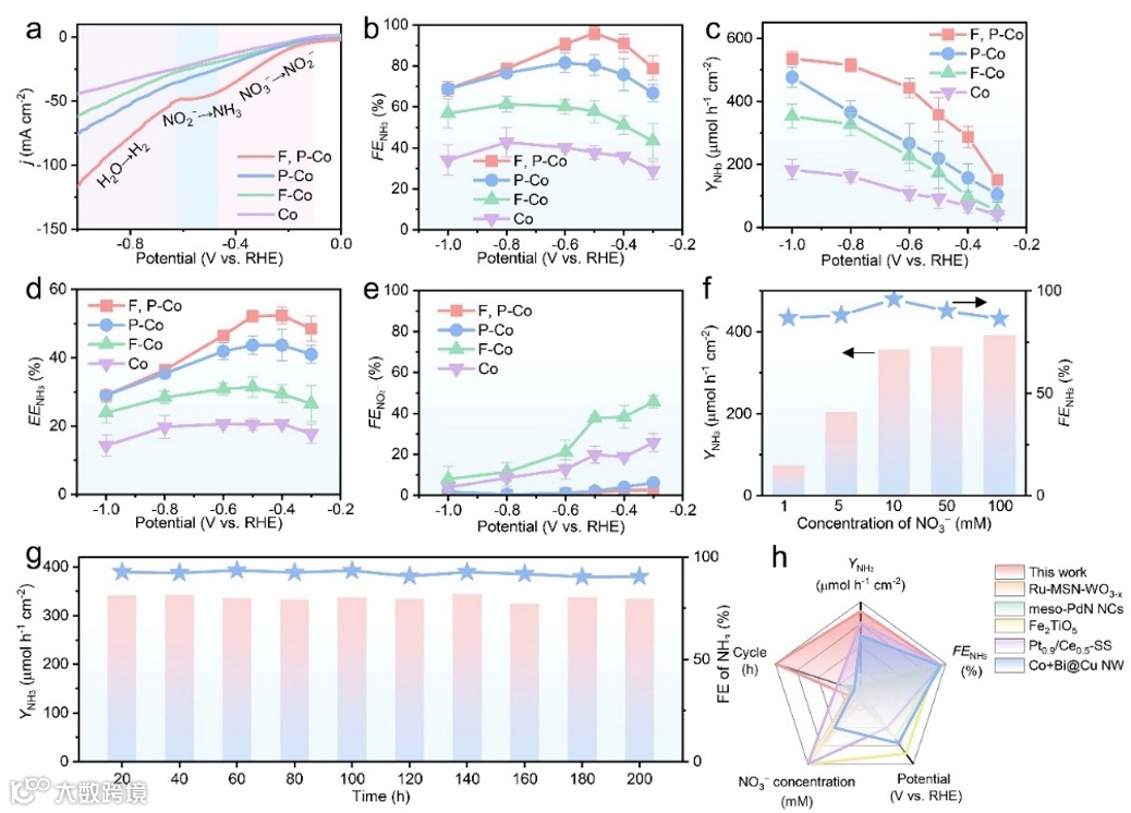 图2. 合成氨的电催化NO3RR性能。a) F, P-Co、P-Co、F-Co和Co在0.1 M K2SO4 + 10 mM KNO3电解液中于10 mV s-1扫描速率下的LSV曲线。b) F, P-Co、P-Co、F-Co和Co在不同电位下的FENH₃、c) YNH₃、d) EENH₃和e) FENO₂⁻。f) F, P-Co在-0.5 V vs. RHE下,于1至100 mM不同浓度NO3-电解液中的YNH₃和FENH₃。g) F, P-Co在流动池中于-0.5 V vs. RHE下的电催化稳定性。h) F, P-Co催化剂与中性电解液中最新报道的电催化剂在YNH₃、FENH₃、循环次数、最佳电位和NO3-浓度方面的性能比较。