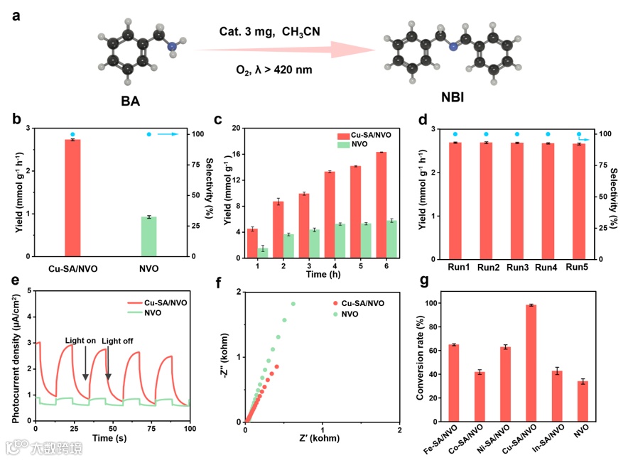 图3. Cu-SA/NVO光催化苄胺氧化偶联的性能。