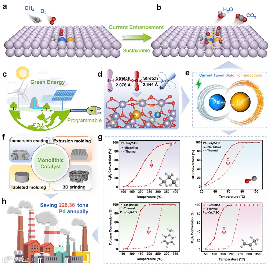 图7. 电流辅助Pd1–Ce1/ATO催化剂的综合机理、普适性及经济分析。Pd1–Ce1/ATO催化剂上CH4催化燃烧模型在a) 纯热和b) 电流辅助条件下的示意图。c) 电流辅助催化的广泛绿色能源来源示意图。d) 基于DFT计算的电流辅助Pd1–Ce1/ATO催化剂中Pd–O–Sn的电子结构和键长。e) Pd1–Ce1/ATO催化剂表面电流调控动态增强Pd–Ce双位点相互作用(电子从Ce转移到Pd)的示意图。f) 工业电流辅助整体式催化剂成型方法示意图。g) 电流调控Pd–Ce双位点策略在增强丙烷(C3H8)、一氧化碳(CO)、甲苯(C7H8)和丙烯(C3H6)催化活性方面的普适性。h) 从贵金属消耗角度对电流辅助催化的经济分析。