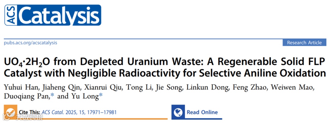 近日,兰州大学龙雨教授,潘多强教授在ACS Catalysis上发表了题为“UO4·2H2O from Depleted Uranium Waste: A Regenerable Solid FLP Catalyst with Negligible Radioactivity for Selective Aniline Oxidation”的研究论文。