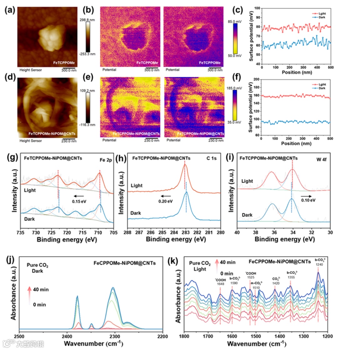 为探明体系内部电荷迁移方向,研究利用原位开尔文探针力显微(KPFM)、准原位X射线光电子能谱(XPS)和原位红外光谱(DRIFTS)开展多维度研究。KPFM结果显示,在光照下,FeTCPPOMe–NiPOM@CNTs表面电位升高约70 mV,远高于单组分体系,表明光生电子由FeTCPPOMe经CNT传输至NiPOM。准原位XPS中,Fe 2p峰正移、W 4f峰负移,进一步印证电子流动方向为Fe→CNT→Ni。DRIFTS谱图中,光照后出现1618、1590 cm-1等特征吸收峰,代表*COOH等中间体的形成与累积,揭示CO2在催化表面的逐步活化与还原过程。该图综合展示了光驱动下电子单向迁移及反应路径的实验依据。