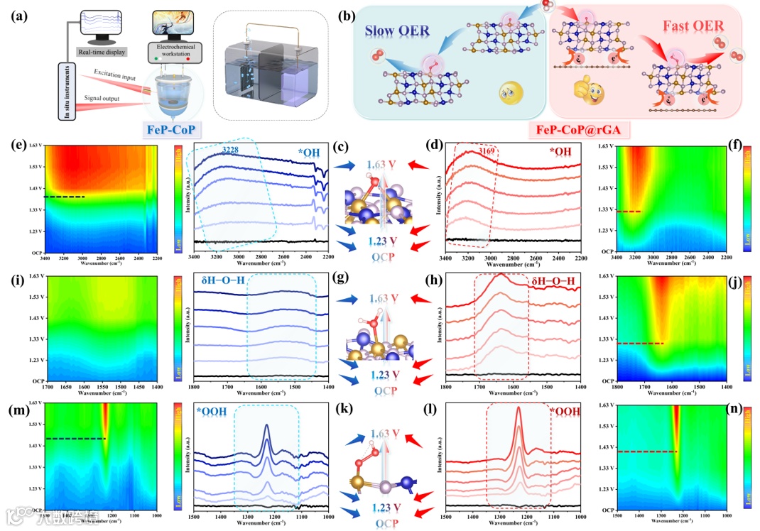 图7. (a) 运行中的ATR- SEIRAS 测量配置示意图, (b) 提出的反应机理,突出显示OER过程中的关键中间体,(c-n)在1 M KOH中,FeP-CoP和 FeP-CoP@rGA在不同电位下记录的 FTIR 光谱和等高线图。