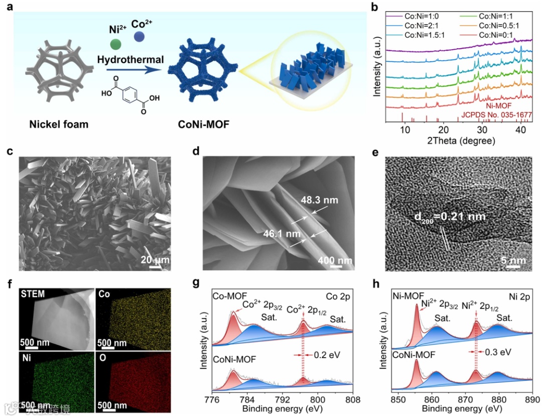 通过一锅法一步合成了CoNi-MOF的纳米片阵列结构,纳米片的厚度大概在50 nm左右,XRD、元素面扫分布以及XPS表征证明了双金属MOF结构,而且Co和Ni元素在纳米片中均匀分布。