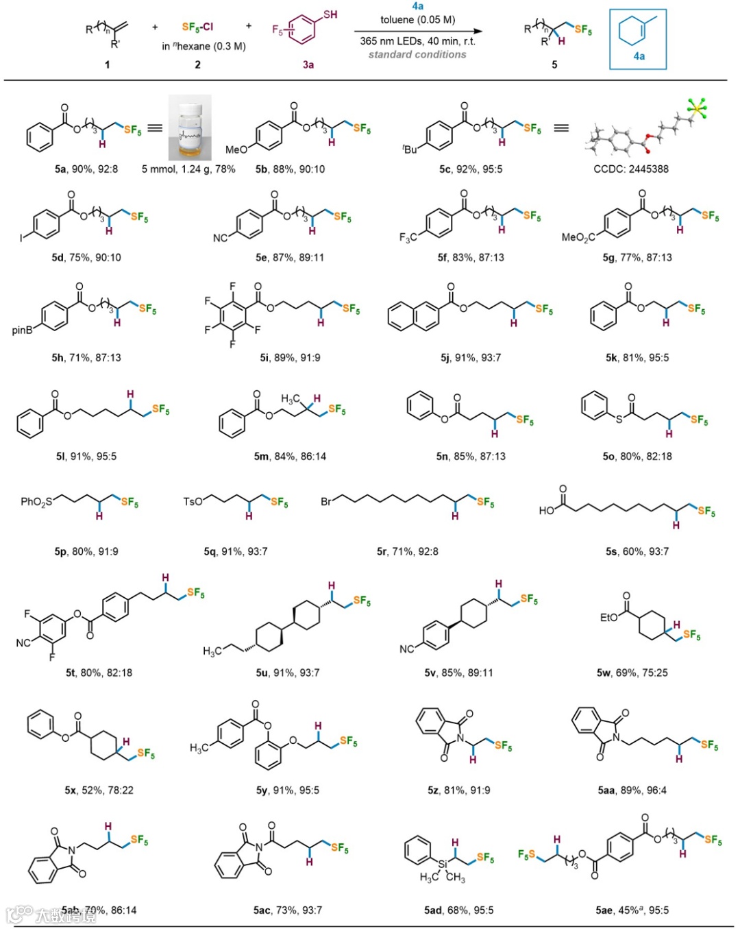 作者首先对五氟硫氯的合成进行了优化,使用如图装置可以获得最高1.5 M浓度的五氟硫氯,解决了先前浓度较低的问题。之后作者对烯烃的氢化五氟硫基化反应条件进行优化,作者发现在室温及365 nm LED光照条件下,以甲苯为溶剂,将非活化烯烃(1a)、SF5Cl(2)、五氟苯硫酚(3a,PFBT)和1-甲基环己烯(4a)共同反应,能以90%的分离收率获得具有良好化学选择性的氢化五氟硫基化产物5a。在不加入PFBT的条件下,仅分离得到原子转移自由基加成(ATRA)产物——氯五氟硫基化副产物5a′,表明PFBT是主要的氢原子供体。溶剂筛选结果显示,甲苯是最佳反应溶剂,而使用THF或乙腈时未观察到产物5a生成。此外,选用二氯甲烷或1,4-二氧六环作为溶剂会导致收率下降和化学选择性变差。与缓慢滴加SF5Cl溶液相比,快速一次性加入会显著提高氯五氟硫基化副产物5a′的生成量。自由基调控剂4a对抑制副产物5a′的形成具有关键作用;若不加入4a,5a与5a′会以接近1:1的比例同时生成。若换用其他调控剂,包括二取代烯烃(4b或4c)或五元环烯烃(4d),也能在一定程度上抑制5a′的生成,但效果均不如最优添加剂4a。