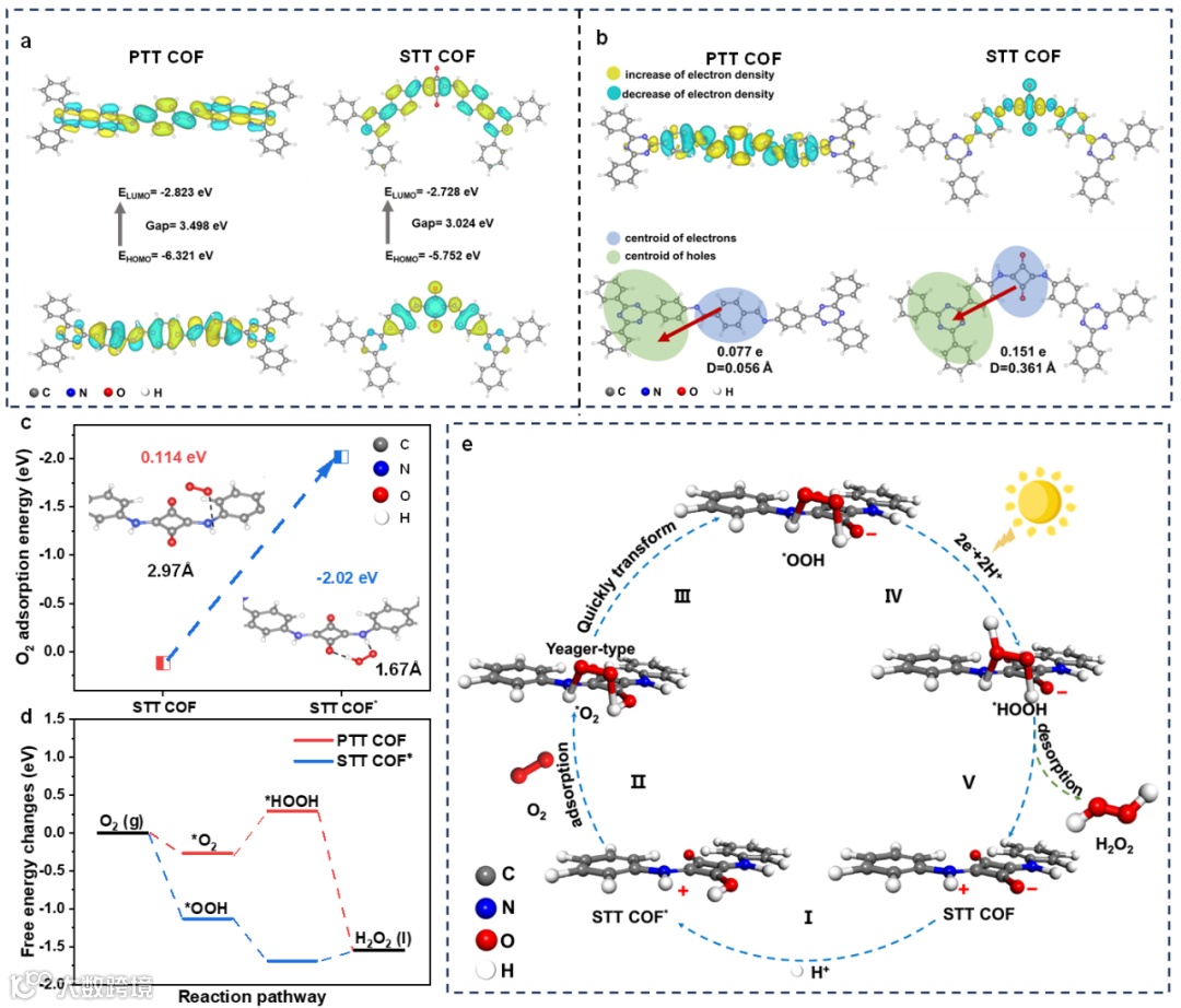 图5. (a) PTT COF和STT COF的HOMO-LUMO分布计算结果。(b) 上方:PTT COF和STT COF基态与激发态电荷密度差计算。(c) STT COF及STT COF*最优位点的O2吸附能。(d) PTT COF和STT COF*光催化氧还原产H2O2的自由能台阶图。(e) STT COF光催化生成H2O2的机制示意图。