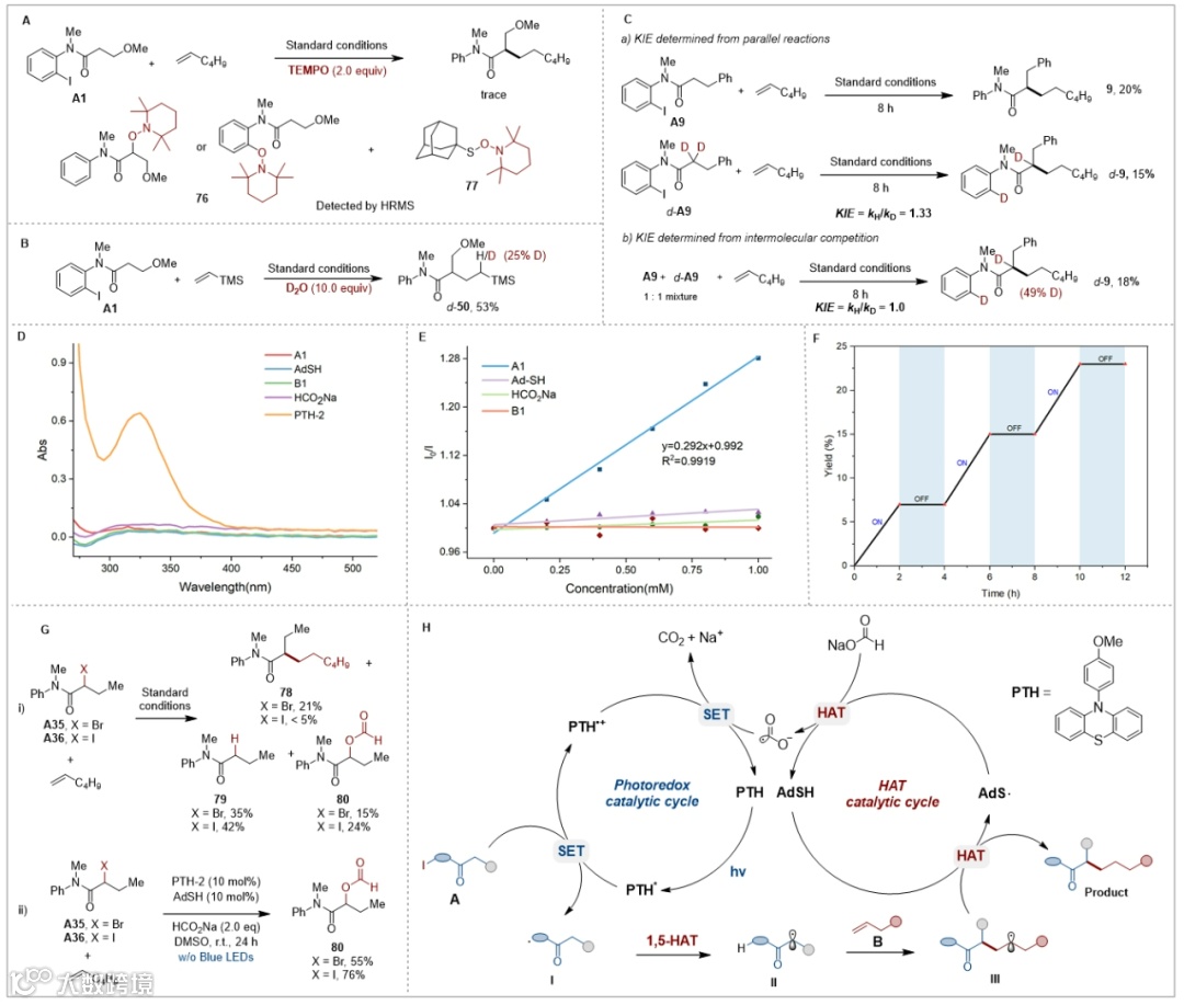 为更深入地理解该反应机理,作者进行了机理实验(图 3)。首先,加入自由基捕获剂TEMPO后反应被完全抑制,并通过HRMS检测到相应的 TEMPO 加合物76 和 77,这表明芳基自由基、α-羰基自由基以及硫自由基是该反应的关键中间体(图 3A)。其次,氘标记实验证明了硫醇在分子间 HAT 过程中的供氢作用(图 3B)。同位素效应(KIE)实验证明,分子内 1,5-HAT 并不是该反应的速率决定步骤(图 3C)。此外,紫外–可见吸收光谱结果表明,在反应条件下,PTH 光催化剂是在 325 nm 激发波长下的光吸收物种(图 3D)。Stern–Volmer 分析进一步证明,芳基碘代物是该反应的淬灭剂(图 3E)。光开关实验(图 3F)的结果排除了自由基链式反应的可能性。最后,作者在标准反应条件下考察了 α-卤代酰胺 A35 和 A36 的反应性(图 3G)。当使用这两类 α-卤代酰胺均产生了大量脱卤副产物、和酰氧取代副产物、(图 3G,i)。在不进行蓝光 LED 照射的对照实验中发现,酰氧取代副产物 80 来自 HCO2Na 与 α-卤代酰胺之间的亲核取代反应(图 3G,ii)。这些结果凸显了我们所建立的催化体系在促进高效 α-烷基化的同时,能够有效抑制副反应的独特优势。