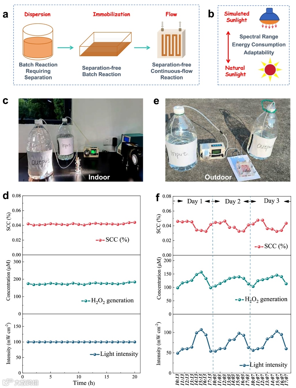 Fig. 6 | Photocatalytic H2O2 synthesis in reactor systems under simulated and natural sunlight.