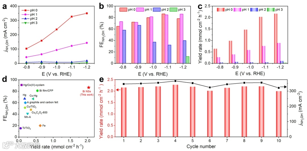 我们在H-型电解池中验证了Bi NSs在不同pH环境下对硝酸根的电催化性能。如图2a-c所示,Bi NSs在酸性电解液(pH ≤ 1)中表现出优异的NH2OH合成活性和选择性,而在中性/碱性电解液中NH2OH的产率显著下降。值得注意的是,在−1.2 V vs RHE条件下,Bi NSs在pH 0下NH2OH的产率高达2.2 mmol cm-2 h-1,超过了大部分目前所报道的NH2OH合成电催化剂(图2d)。此外,在pH 0电解环境中,-1.2 V vs RHE电位下连续反应10次循环后NH2OH的产率和电流密度分别保持在2.0 mmol cm-2 h-1和321.2 mA cm-2,表明Bi NSs具有良好的催化稳定性(图2e)。
