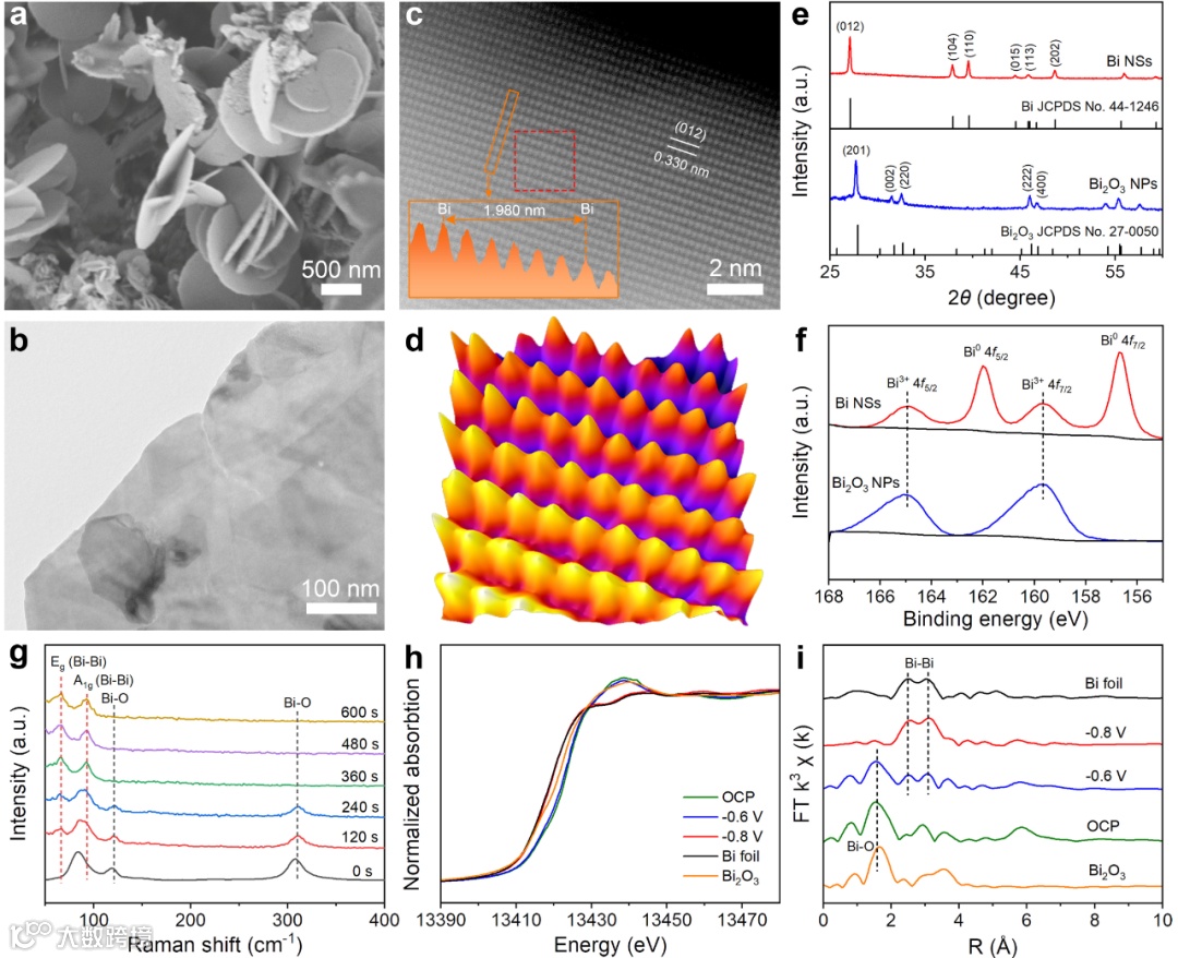 研究团队首先通过水热法制备出附着在泡沫镍表面的氧化铋颗粒(Bi2O3 NPs),随后通过电还原得到均匀且致密地附着在泡沫镍表面的铋纳米片(Bi NSs)。扫描电子显微镜(SEM)和透射电子显微镜(TEM)图像证实了铋的纳米片结构(图1a-b)。球差校正高角环形暗场扫描透射电子显微镜(HAADF-STEM)图像、X-射线衍射(XRD)以及X-射线光电子能谱(XPS)则表明了Bi NSs的金属物相(图1c-f)。通过原位拉曼以及原位X射线吸收谱表明了电还原过程中Bi3+到Bi0的转换,进一步说明了金属Bi纳米片的成功制备(图1g-i)。