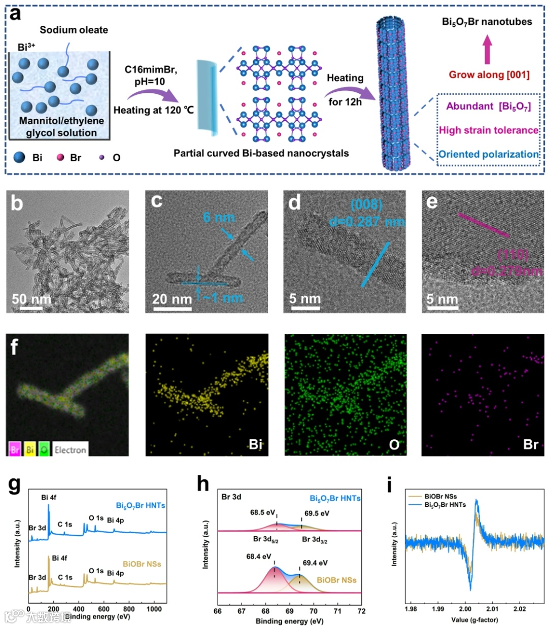 当在Bi-O层间嵌入高电负性卤素层[X] (X=Cl, Br, I)形成层状卤氧化铋压电材料时,沿层堆叠方向可形成强内建电场(IEF),展现出优异的结构可设计性。构建[Bi5O7]层以提升6s轨道含双孤对电子的Bi原子与Br原子之间的比例,可能有效调控压电特性及与半导体阻值相关的能级。同时,相较于对称的[Bi2O2]层,[Bi5O7]层的非对称构型可能有助于增强压电极化。另一方面,通过形貌工程构建的一维超薄空心纳米管结构不仅保留二维材料的诸多优势,还兼具强应变承受度、更高力敏感性。而且,一维超薄空心纳米管结构凭借其曲面弯曲、受限的堆积程度及隔离的内表面导致的低接触概率而有所抑制团聚现象。此外,层状卤氧化铋材料中IEF方向与范德华力连接的[Bi-O]n层和[X]层堆叠方向一致,通常导致二维材料结构IEF积累较弱,而一维空心纳米管结构可能沿轴方向实现定向极化。基于上述分析,开发含有定向极化单元的一维Bi5O7Br纳米管作为高效压电催化剂,有望实现机械能向清洁氢能的高效转化。
