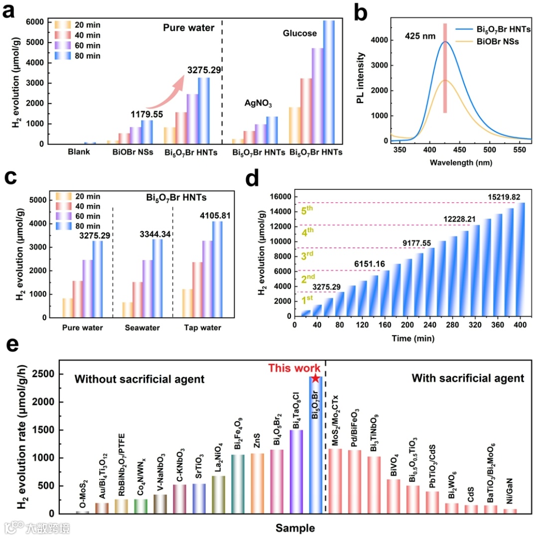 1) 在超声振动驱动下,Bi5O7Br HNTs无需任何牺牲剂与助催化剂即可实现2456.48 μmol·g-1·h-1的H2析出速率,对应的机械能-氢能转换效率达0.28%,是BiOBr NSs的2.8倍,H2析出性能显著优于当前报道的大部分先进的压电催化剂。
