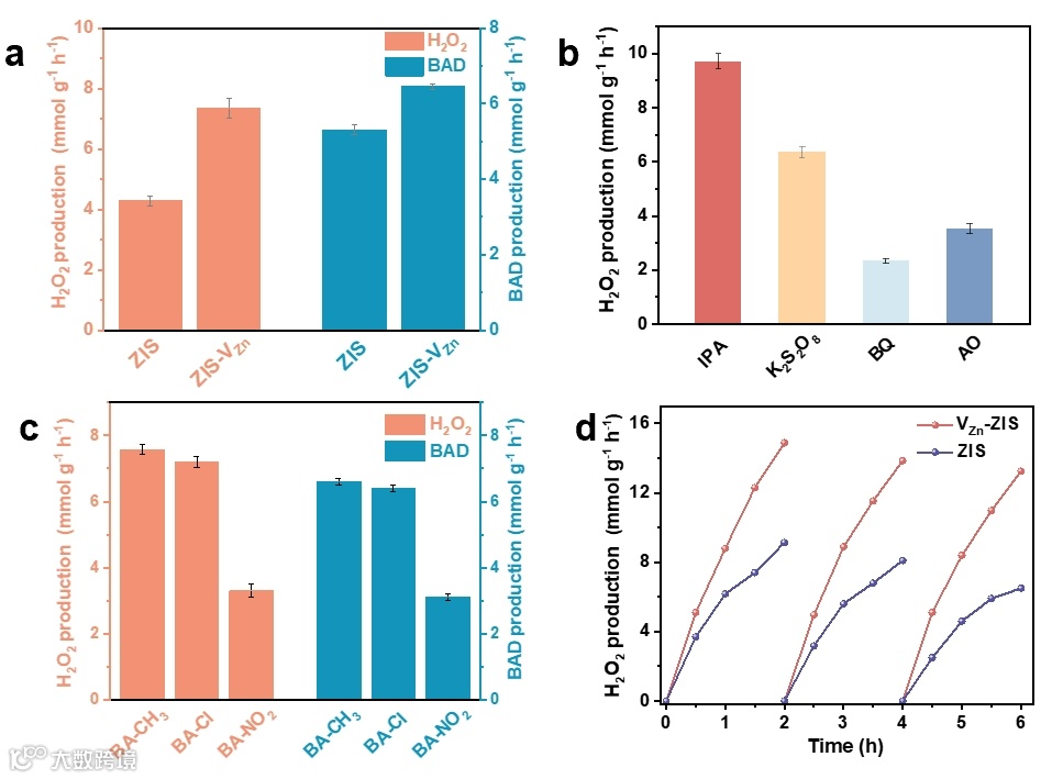 (2) ZnIn2S4锌空位催化剂(ZIS-VZn)在光催化合成过氧化氢和有机物氧化反应中展现出超高效率。