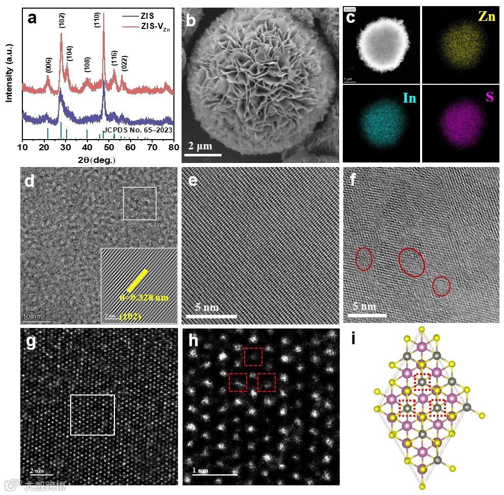 图1. 结构与形貌表征。(a)ZIS和ZIS-VZn的XRD图谱;(b)ZIS-VZn的SEM图像;(c)EDS元素分布图;(d)ZIS-VZn的HRTEM图像;(e)ZIS的AC-HRTEM图像;(f)ZIS-VZn的AC-HRTEM图像;(g)ZIS-VZn的HADDF-HRTEM图像;(h)图g的局部放大图;(i)晶体结构模型(灰色:Zn;黄色:S;粉色:In)。