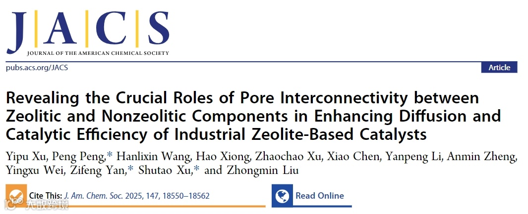 相关成果以“Revealing the Crucial Roles of Pore Interconnectivity Between Zeolitic and Non-Zeolitic Components in Enhancing Diffusion and Catalytic Efficiency of Industrial Zeolite-Based Catalysts”为题,于近日发表在《美国化学会志》(Journal of the American Chemical Society)上。该论文第一作者是中国石油大学(华东)、中国科学院大连化学物理研究所联合培养博士生徐亦璞。共同通讯作者为中国石油大学(华东)/武汉科技大学彭鹏副教授、中国石油大学(华东)阎子峰教授、大连化学物理研究所徐舒涛研究员。
