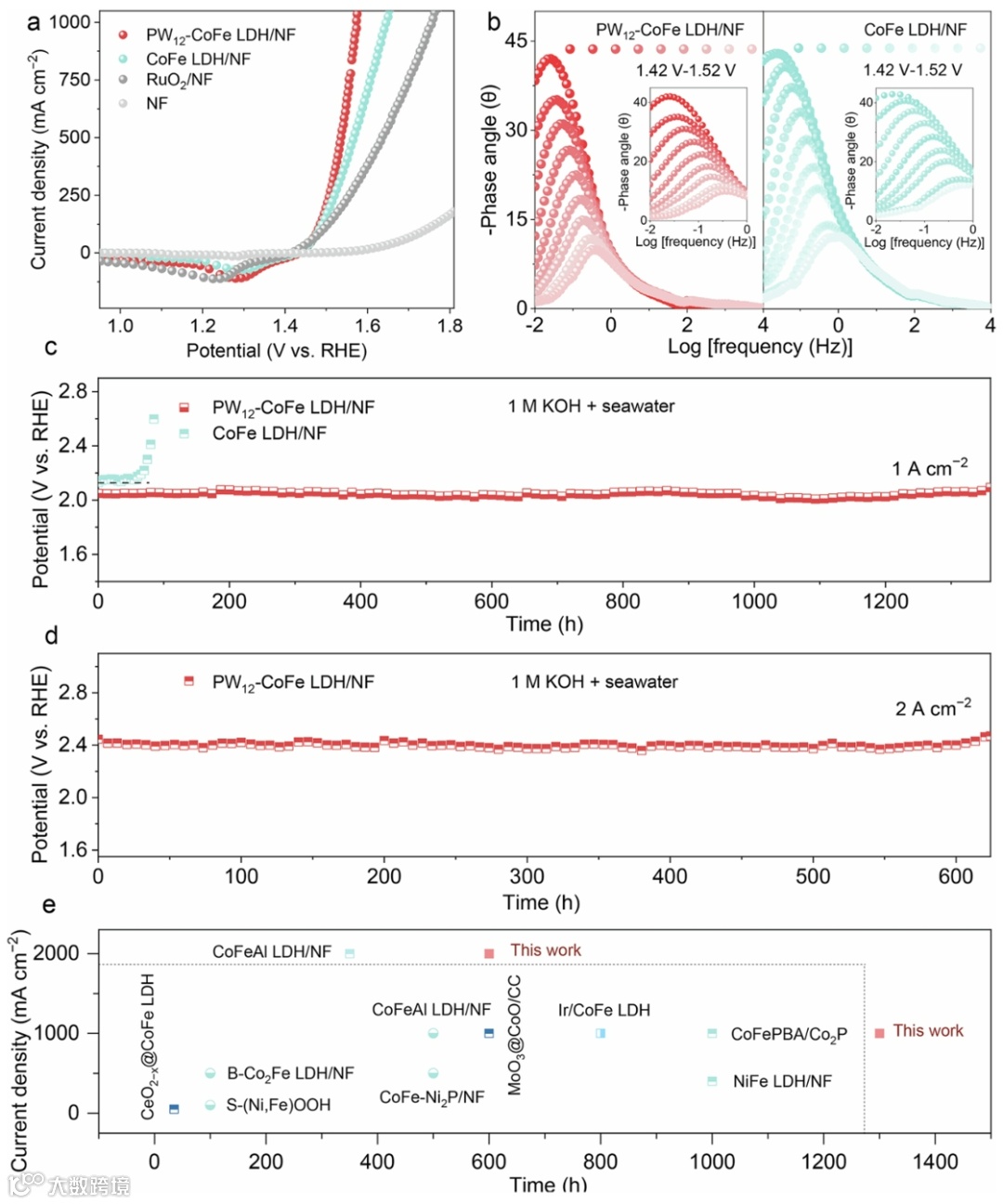 PW12-CoFe LDH/NF可在1 A cm-2下稳定运行1300小时,在2 A cm-2下维持600小时。其性能优于多数已报道ASO电极材料,显示出卓越的电化学稳定性与抗氯腐蚀能力。