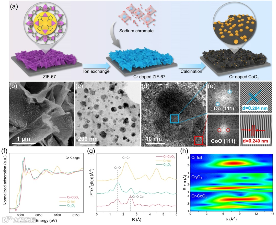 通过对ZIF-67采用离子交换法并结合随后的煅烧过程,形成了分散在氮掺杂碳基底的Cr掺杂CoOx纳米颗粒。在离子交换过程中,ZIF-67的配体被CrO42-部分取代;随后在氢/氩混合气氛煅烧过程中,Cr掺杂ZIF-67纳米片转变为Cr-CoOx颗粒。通过XANES和EXAFS研究了催化剂中Co的价态以及配位结构,证实了Cr的成功掺杂(图2)。