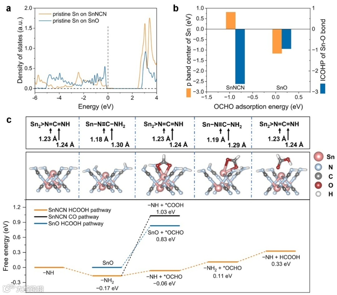 通过密度泛函理论(DFT)计算揭示了SnNCN催化剂的活性来源。SnNCN具有更多的活性空轨道,能够更强地结合*OCHO中间体,使ECO2R过程在能量上可行。由于内建[NCN]2–的优势,SnNCN相较于SnO具有更低的获得*OCHO中间体的能垒,促进*OCHO形成。