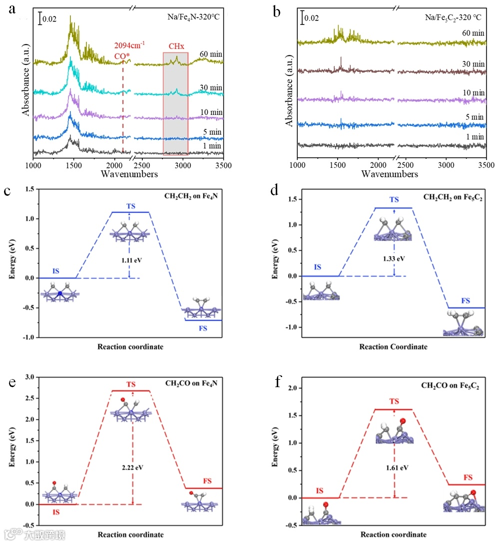 Figure 7 In situ infrared spectra of (a) Na/Fe4N and (b) Na/Fe5C2 catalysts in reaction atmosphere. Energy barrier of CH2+CH2 on (c) Fe4N(110) surface and (d) Fe5C2(11-2) surface. Energy barrier of CH2+CO on (e) Fe4N(110) surface and (f) Fe5C2(11-2) surface.