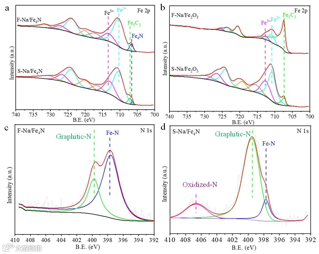 用XPS表征了Na/Fe4N和Na/Fe2O3催化剂的表面化学状态和结构演变。在CO气氛(50 mL/min) 350℃下还原Na/Fe2O3 5 h合成Na/Fe5C2,其中F-Na/Fe4N和F-Na/Fe2O3代表反应前的Na/Fe4N和Na/Fe5C2催化剂,S-Na/Fe4N和S-Na/Fe2O3代表反应14 h后的催化剂。图5a-b分别为Na/Fe4N和Na/Fe5C2催化剂反应14 h前后的Fe 2p谱图。通过曲线拟合计算各铁物种的比例(表S4)。对于Na/Fe4N催化剂,706.7 eV的结合能归属于Fe4N,710.3 eV和713.2 eV的结合能归属于Fe2+和Fe3+。Fe2+和Fe3+的存在也证实了铁氧化物在表面的存在,与TEM图像和制图一致(图1c和S3)。反应14 h后,Fe4N和Fe5C2的强度下降。对于Na/Fe5C2催化剂,反应前催化剂表面主要以Fe5C2组分为主。反应后,随着Fe2+和Fe3+组分含量的增加,Fe5C2的含量降低。图5c-d为Na/Fe4N催化剂反应前后N 1s的XPS谱图。不同N物种的半定量计算总结于表S5。反应前表面N主要为石墨N (399.7 eV)和Fe-N (397.6 eV)。反应后,表面氮的种类和含量发生了变化。Fe-N含量从70.9%下降到12.1%,石墨N含量从29.1%上升到72.9%,400.7 eV出现了15.0%的N氧化物。结果表明,在反应过程中,Fe4N分别转变为Fe5C2、石墨N和氧化物N。