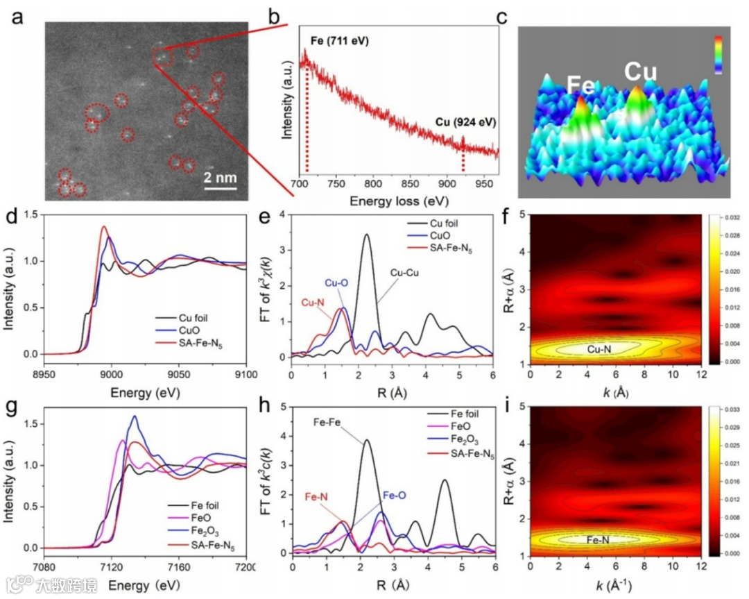 本工作采用单壁碳纳米管(CNT)为载体,通过1,10-菲啰啉配体同步锚定Cu2+/Fe2+前驱体,经快速蒸发干燥和800℃氩气煅烧生成Cu/Fe双原子催化剂。酸洗后ICP-OES测得Cu(0.44 wt%)、Fe(0.89 wt%)负载量,HAADF-STEM与EELS证实Cu、Fe原子级分散且邻近;XPS显示Cu引入使Fe 2p结合能负移0.3 eV,证实Cu/Fe之间的电子转移;BET表征显示双原子催化剂比表面积(326.5 m2/g)显著高于Fe单原子催化剂(170.4 m2/g),揭示其丰富的介孔结构优势。最后通过EXAFS拟合确认Cu-N5(配位数4.7)和Fe-N5(配位数5.1)的配位构型,最终确定Cu-N5/Fe-N5双原子位点。