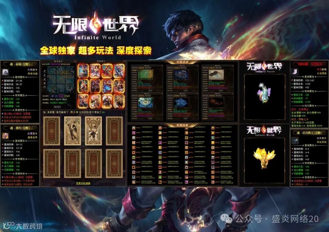 【无限世界·圆梦版 05月05号11.00开放】七个章节,版本类型:单职业 ,聆风引擎,圆梦版!!圆梦版!!圆梦版!!剑灵进化,魂卡,铭文,建功立业,江湖风采,神器融合,种族关系,岁月轮回,荣誉段位等等,超级超级多内容 每个章节都有不一样的玩法!!!! 喜欢玩单职业的千万不要错过,打怪难度,一般,好玩程度,非常好玩!
