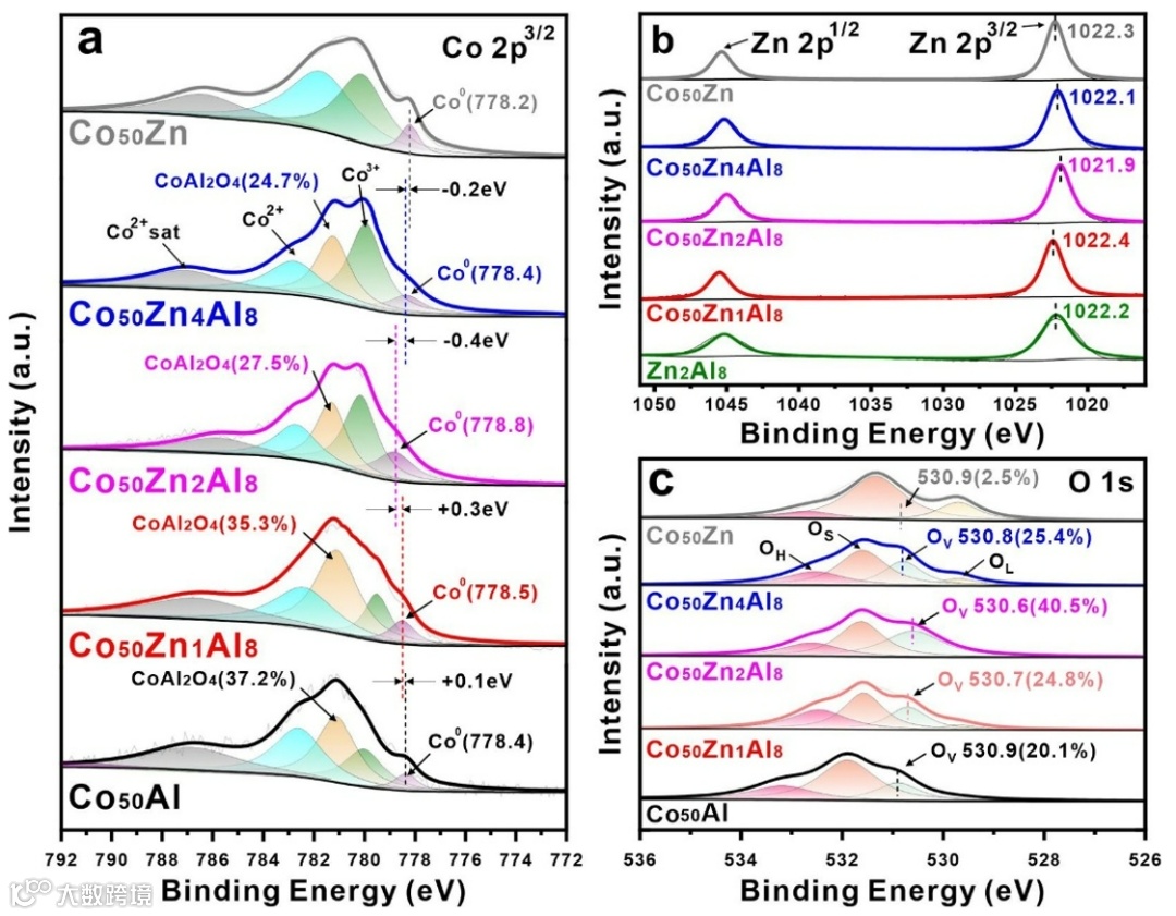 Co50Zn2Al8催化剂中,电子从Co向ZnO转移,使Co0具有最高的结合能(778.8eV),这是由于Co50Zn2Al8催化剂具有最高的氧空位(OV)含量,这些氧空位在催化剂中充当了捕获电子的陷阱,接受了来自Co的电子,进而生成丰富的Coδ+物种。