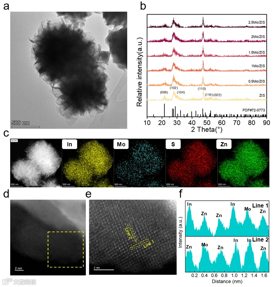 图1 | 光催化剂的形貌与结构表征。a. Mo/ZIS的透射电子显微镜(TEM)图像;b. Mo/ZIS的X射线衍射(XRD)谱图;c. Mo/ZIS的高角度环形暗场扫描透射电子显微镜(HAADF-STEM)图像及相应的元素分布图;d. Mo/ZIS的HAADF-STEM图像;e. 对应于(f)中标记的line1和line2的线扫描分析结果。
