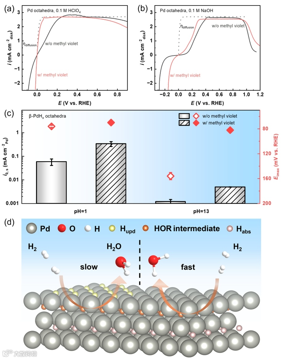 为了验证上述假设,我们使用Pd八面体和立方体作为模型催化剂,用甲基紫分子装饰催化剂表面,并研究表面改性影响下的Habs吸收/解吸行为和HOR活性的关系。在电极上修饰甲基紫分子后,酸性和碱性电解质中Pd八面体和立方体的Hupd峰均受到显著抑制,表明Pd表面Hupd位点已被甲基紫覆盖,Habs吸收/解吸的速率和可逆性在酸性和碱性电解质中都得到了显著增强,这些观察表明,甲基紫分子在Pd表面的修饰显著加速了Habs的吸收/解吸动力学。