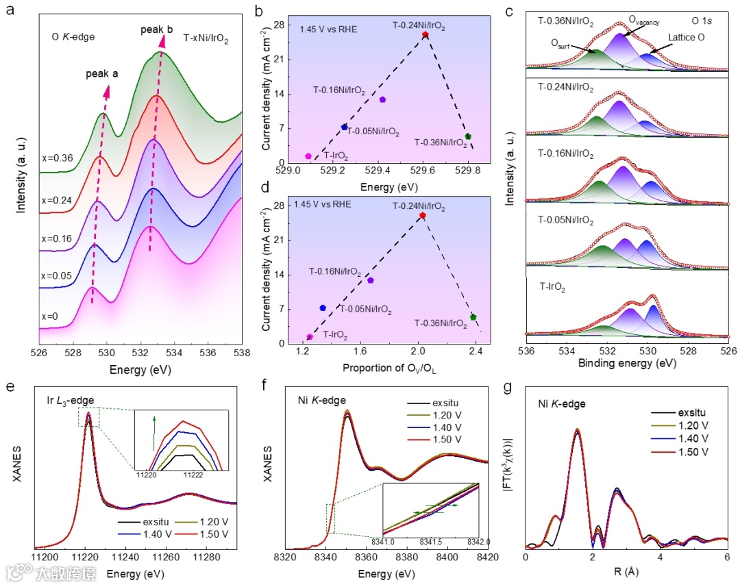利用X射线吸收谱和XPS的结果建立了Ir-O共价性/氧空位和催化性能的火山模型,得出适度的Ir-O共价性和氧空位浓度能提高催化活性,原位同步辐射技术吸收谱观察到Ni的电子态的变化可以促进OER反应。
