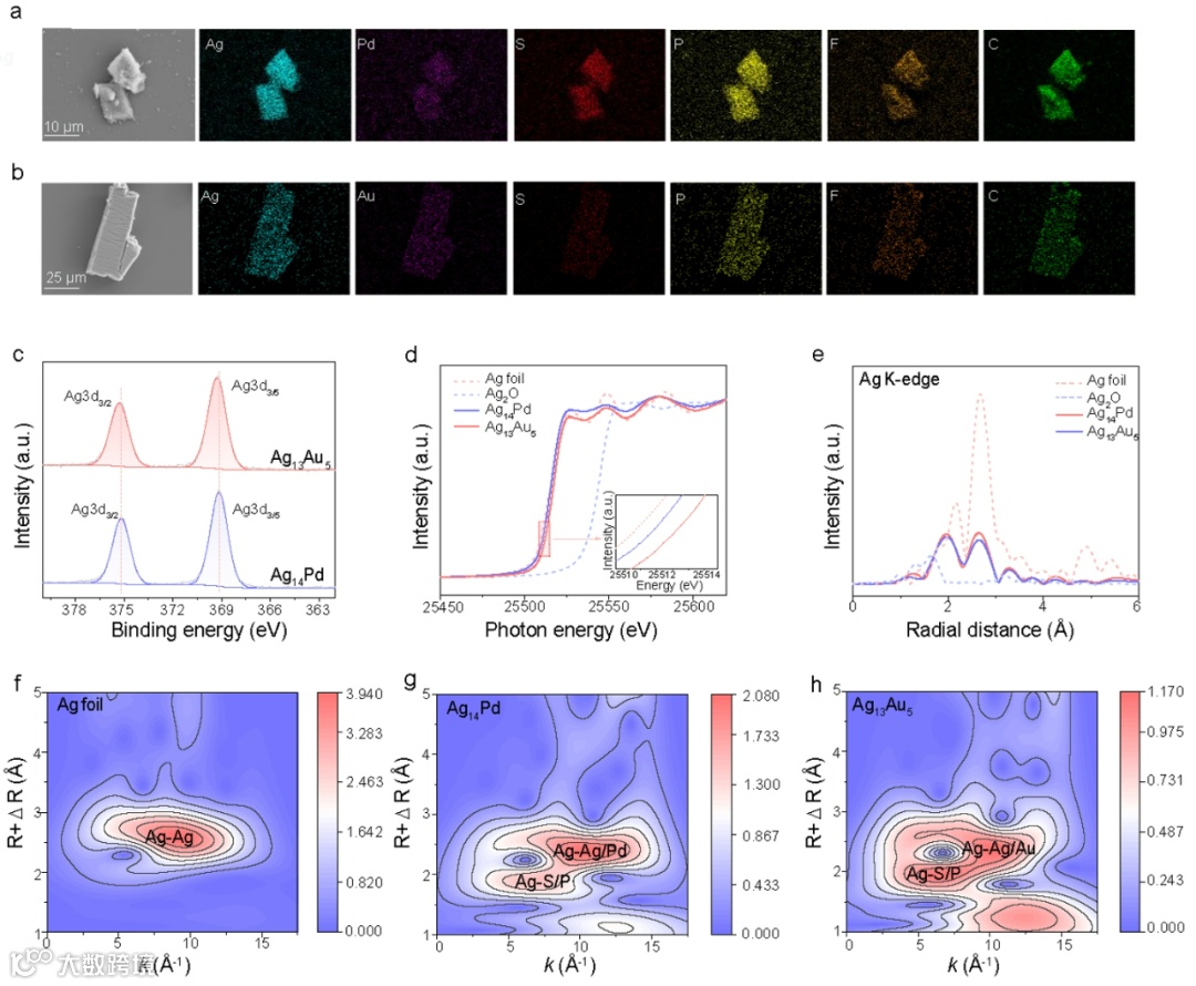 图2. 结构表征。(a) Ag14Pd和(b) Ag13Au5簇的EDS元素映射图。(c)团簇的Ag 3d XPS光谱。(d) Ag14Pd和Ag13Au5簇Ag k-edge的归一化XANES光谱。(e) Ag14Pd和Ag13Au5簇Ag k-edge的EXAFS光谱的k3加权χ(k)函数。以银箔和Ag2O为标准样品。(f) Ag箔、(g) Ag14Pd簇的Ag k-edge、(h) Ag13Au5簇的Ag k-edge的k3加权EXAFS数据WT等高线图。