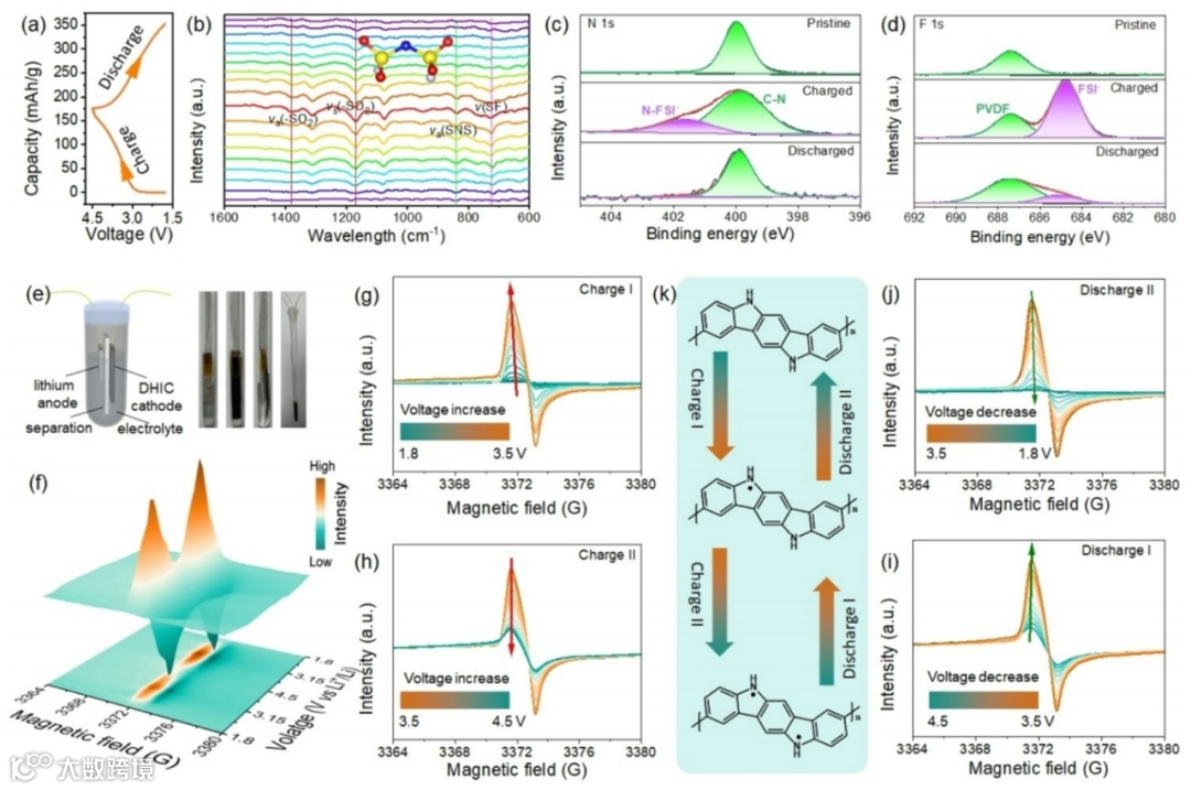 图4. pDHIC的储能机理。(a) 典型充放电曲线。(b) 原位FT-IR光谱。在原始、完全充电和放电状态下的(c) N 1s和(d) F 1s XPS光谱。(e) 原位EPR设备示意图和照片。(f)原位EPR曲线。对应充电状态范围为(g) 1.8 ~ 3.5 V和(h) 3.5 ~ 4.5 V,放电状态范围为(i) 4.5 ~ 3.5 V和(j) 3.5 ~ 1.8 V。(k)结构演化机理。