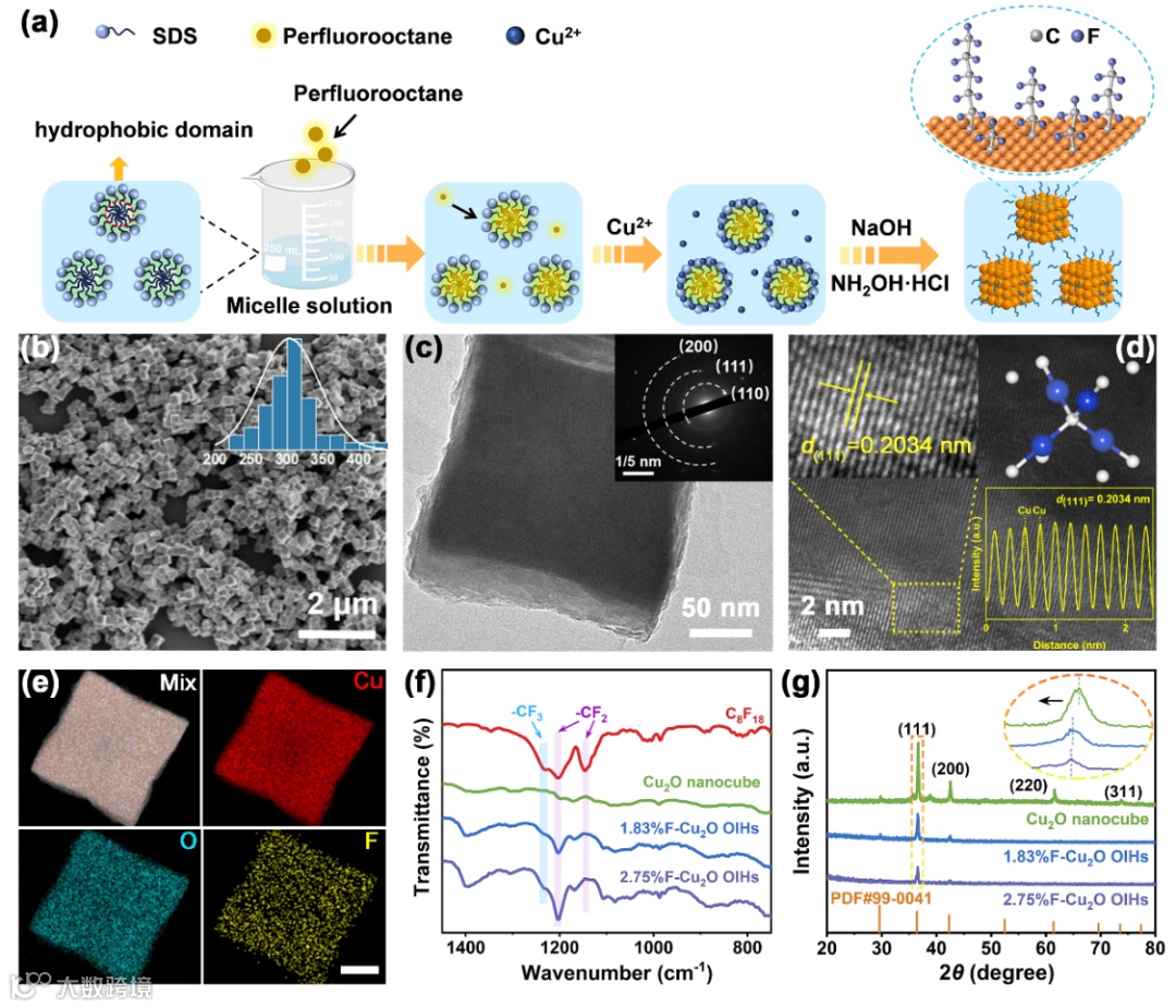 图 1:Cu2O 纳米立方体与x%F-Cu2O OIHs结构表征。(a) x%F-Cu2O OIHs合成示意图;1.83% F-Cu2O OIHs的(b) SEM及直径分布图;(c) TEM及对应的SAED;(d) HRTEM及Cu2O晶胞;(e) EDS;三种催化剂的(f) FT-IR谱图;(g) XRD。