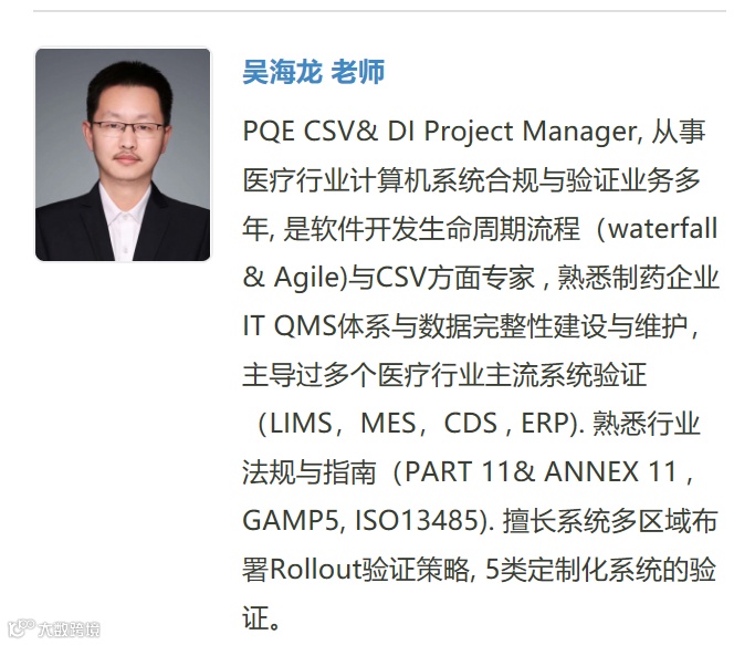 为帮助企业提升验证管理水平,提高CSV管理人员的理论和实践能力。践行QbD的理念,在系统设计与实施中提供最优的合规方案。PQE中国联合蒲公英推出一系列CSV讲座,本期讲座将介绍前沿技术(SaaS, AI,PaaS)的验证策略与测试要求。