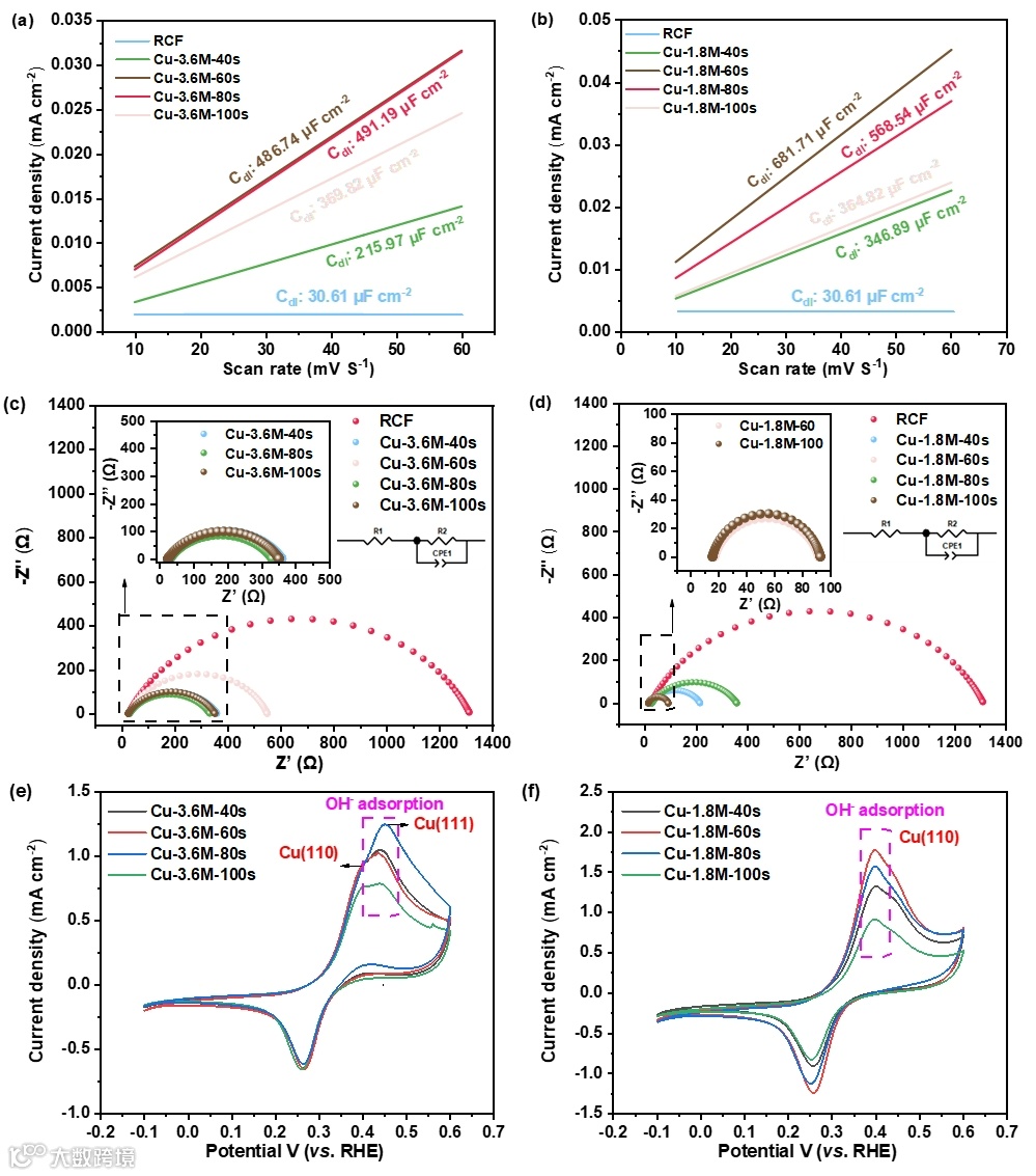 通过电化学阻抗谱(EIS)还研究了电极的电子转移行为。结果表明,增加Rf可以增强电极界面电荷转移能力,有利于多质子-电子耦合反应。OH-电化学吸附实验进一步证实,通过表面重构可以控制材料的晶面取向。在1 M KOH溶液中得到的循环伏安特性曲线表明,Cu(110)和(111)晶面上的OH-吸附峰分别对应于0.41和0.46 V(vs. RHE)。对于Cu-3.6M系列催化剂,Cu(111)晶面的OH-电化学吸附峰最为明显,这意味着与Cu(110)晶面相比,电极表面暴露出更多的Cu(111)晶面。与Cu-3.6M-40s、Cu-3.6M-60s和Cu-3.6M-100s相比,Cu-3.6M-80s的Cu(111)晶面OH-电化学吸附峰较为明显,这说明在高浓度酸性CuCl2蚀刻溶液中反应80 s后,该电极Cu(111)晶面择优取向。本研究中Cu-3.6M-80s对CH4的高选择性可归因于蚀刻后在电极表面暴露较多的Cu(111)晶面,这有利于eCO2R生成CH4。有趣的是,Cu-1.8M系列催化剂在Cu(110)晶面显示出明显的OH-电化学吸附峰,这表明Cu(110)的暴露度高于Cu(111)。并且,Cu-1.8M-60s催化剂的Cu(110)晶面OH-电化学吸附峰更突出,说明在低浓度酸性CuCl2蚀刻液中反应60 s后电极表面暴露了更多的Cu(110)晶面。结合原位XRD和电化学性能结果初步表明,Cu-1.8M-60s在经过蚀刻后,暴露出的Cu(110)和CuCl(111)晶面在催化过程中产生协同效应,使得该样品对C2H4具有较高的选择性。