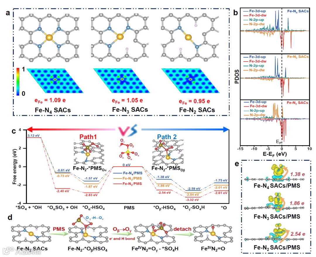图4.(a)Fe-Nx SACs的结构模型以及二维电子密度分布图像。(b)Fe-Nx SACs中Fe原子和N原子的PDOS。(c)在不同吸附位点上的可能反应路径的自由能。(d)Fe-N2 SACs上的PMS的反应路径。(e)PMS吸附后Fe-Nx位点的差分电荷密度。