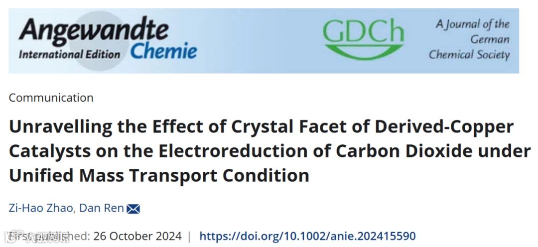 Zi-Hao Zhao & Dan Ren*. Unravelling the Effect of Crystal Facet of Derived-Copper Catalysts on the Electroreduction of Carbon Dioxide under Unified Mass Transport Condition. Angew. Chem. Int. Ed. DOI:10.1002/anie.202415590.